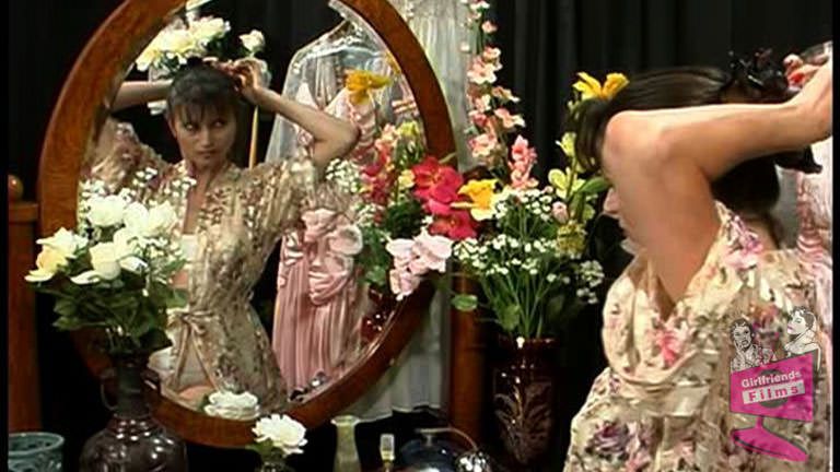 Jessica tries on everything in closet right down to the stockings. But what she keeps on, and in, is a massive vibrating cock she straddles until she orgasms over and over. She stays on that thing until it throws her off but it never does. At least her stockings stay in place, as well as the vibrator deep inside her.